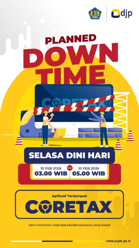 Dalam rangka maintenance sistem, maka hari ini, Kamis 5 Februari 2026 akan dilakukan downtime pada sistem Coretax pada pukul 20.00-22.00.